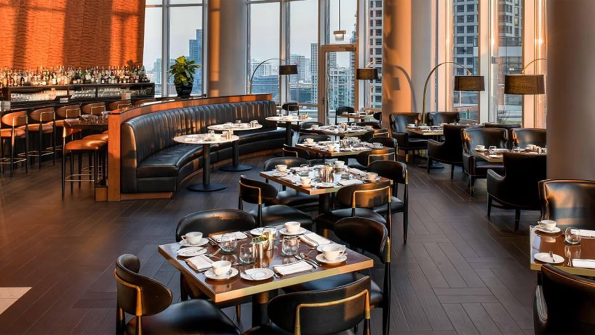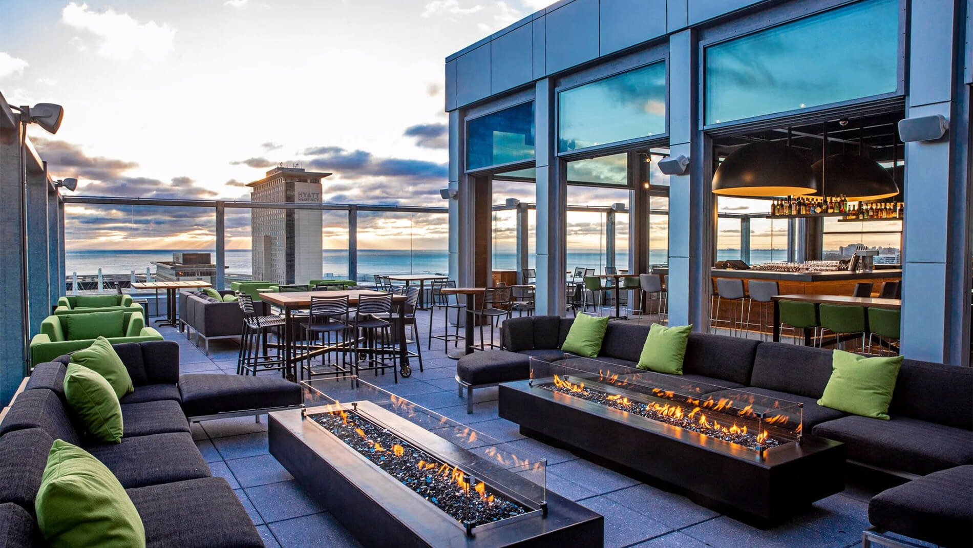 Elevator Pitch: A rooftop lounge atop Hotel Lincoln with sweeping views of the lake and skyline, seasonal cocktails, and an airy atrium style setting.