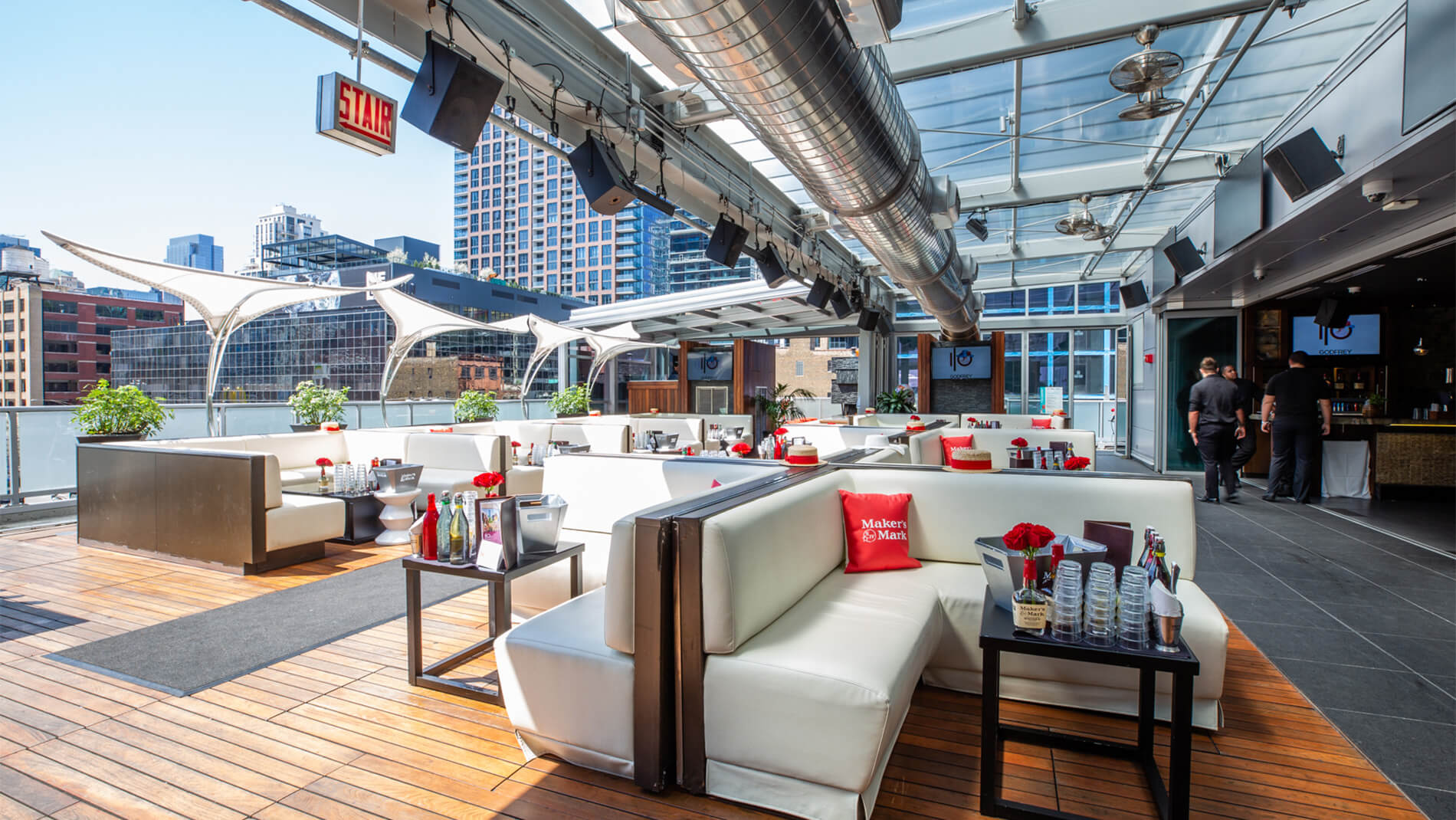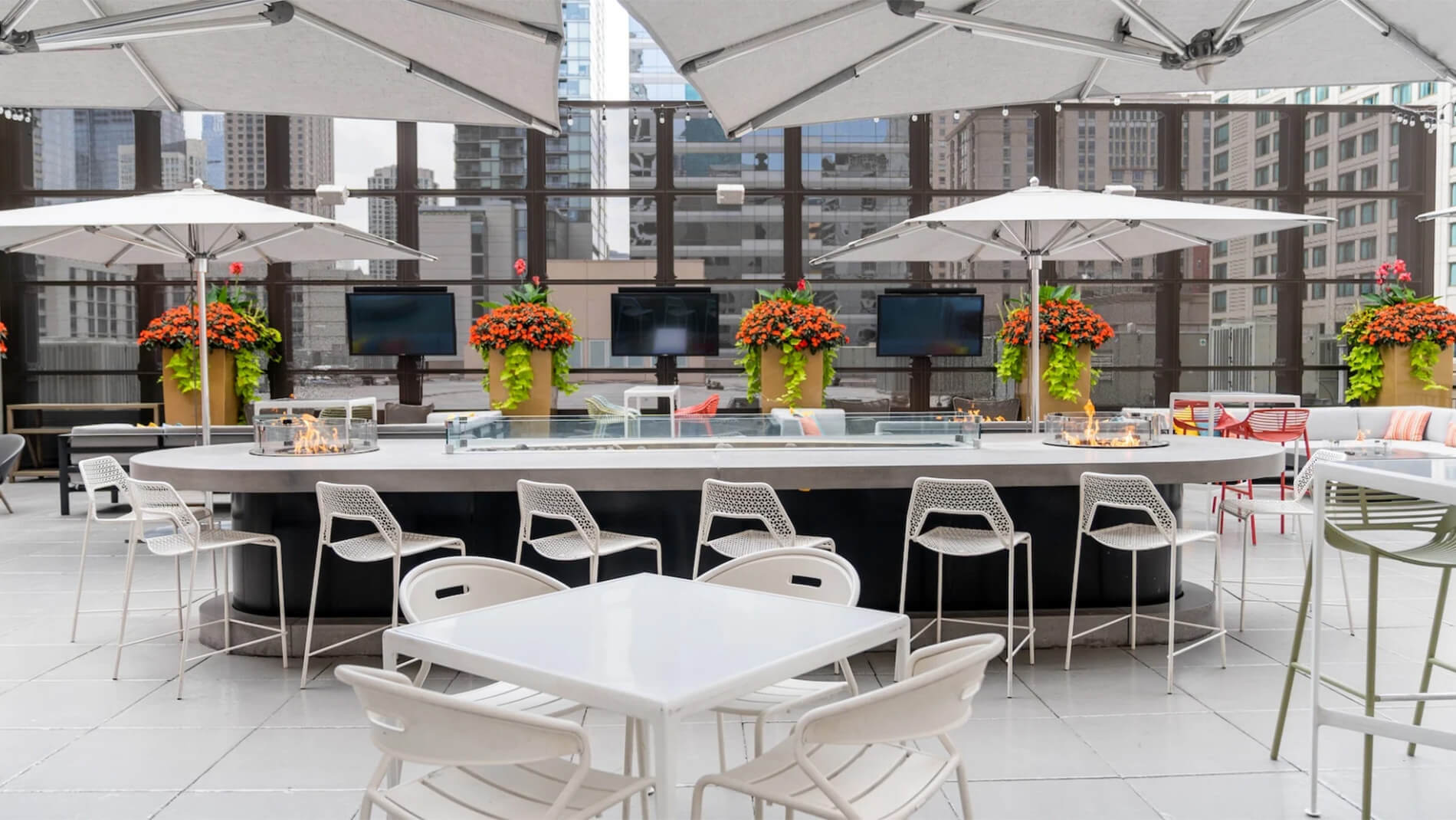 Elevator Pitch: Expansive indoor/outdoor “roofscape” atop The Godfrey, with retractable roof, fire pits, skyline views, and year-round energy.