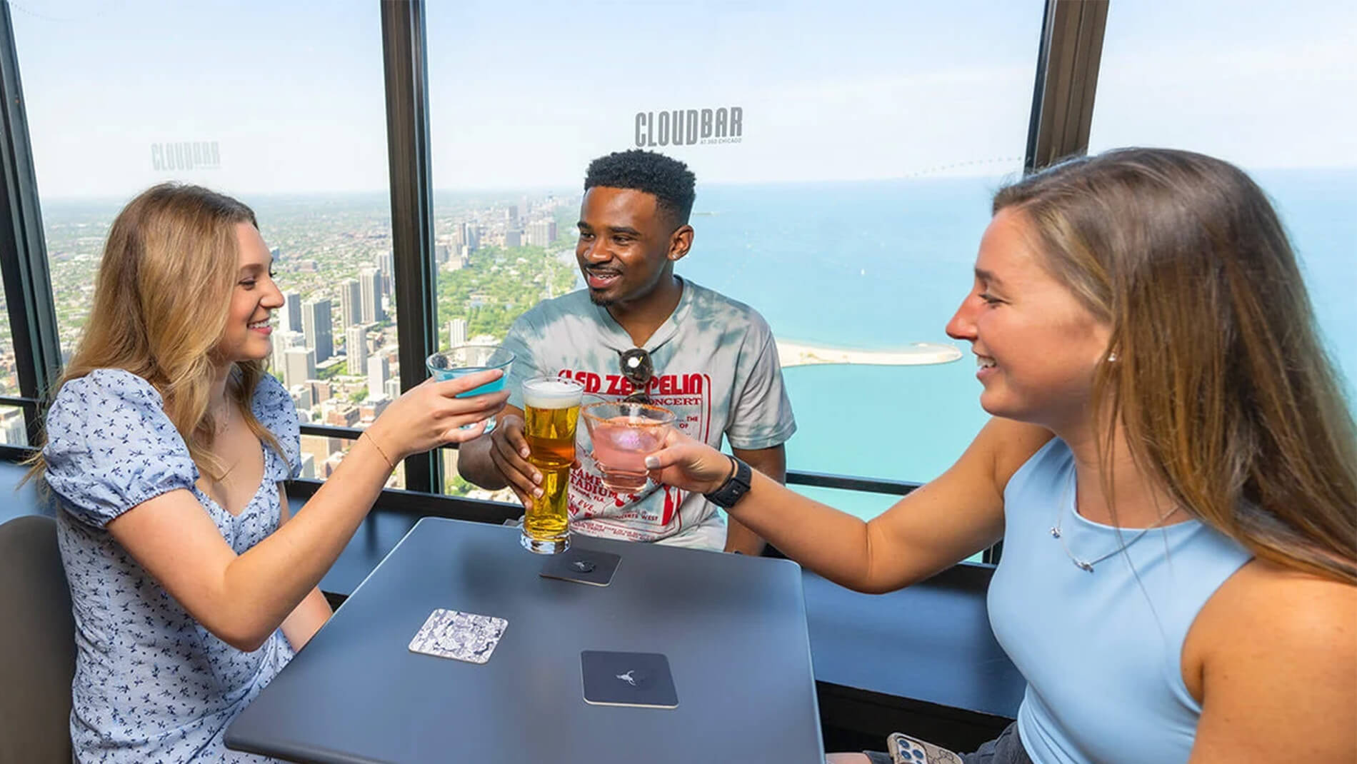 CloudBar, the top bar in Chicago with a view, is open from 9 am-11 pm daily. Special tickets are available for admission on the Observation Deck, which include a drink from a select menu (Sip & View Ticket) or a Sip, TILT, and View Ticket, which includes a ride on TILT— one of the highest thrill rides in the world. Enter with an admission ticket and stay as long as you like!