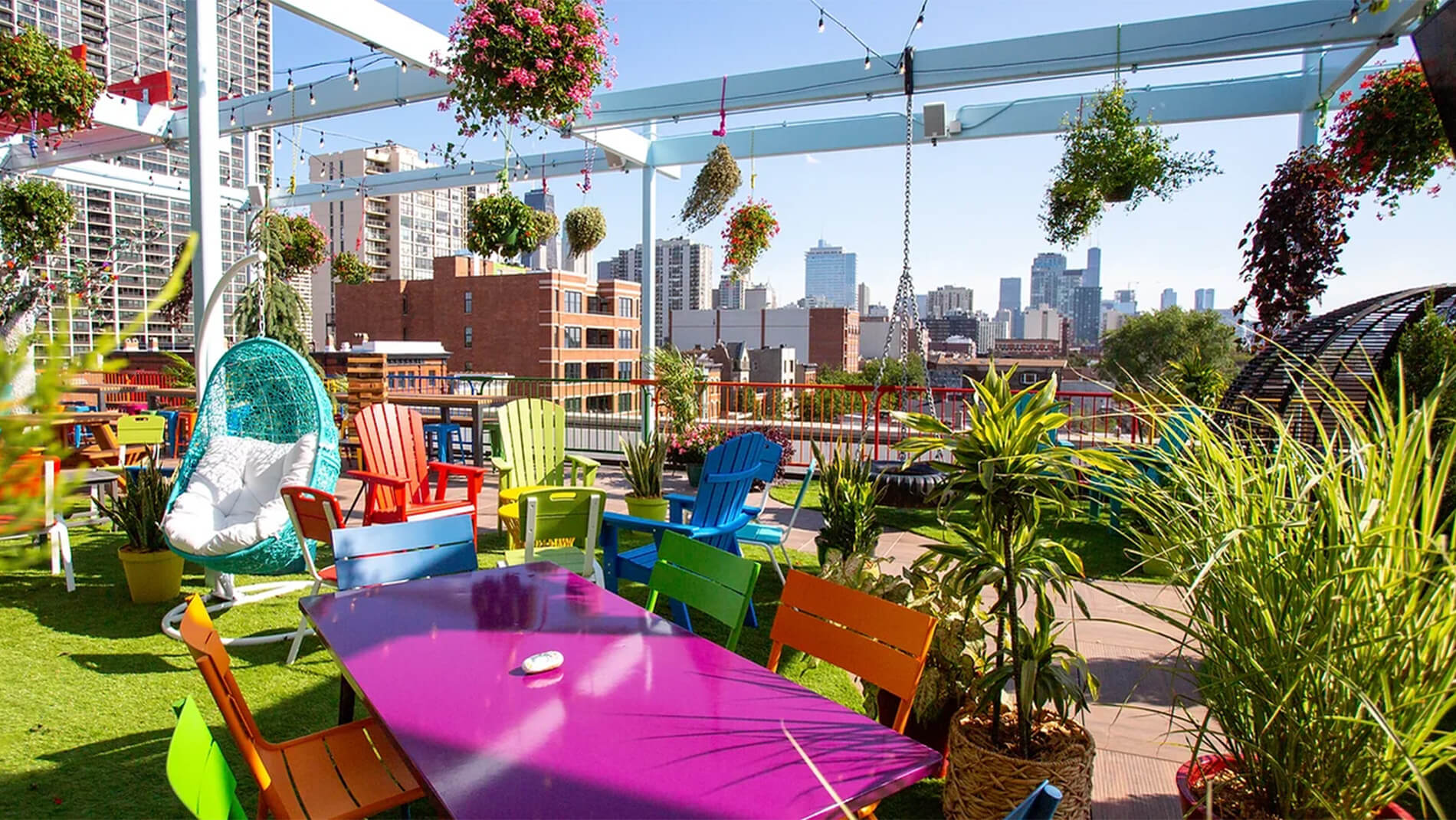 Utopian Tailgate, is known for its color! Located above the home of comedy—Second City, this bar offers an eclectic mix of games, colorful décor, and sweeping views of the Chicago skyline from its spacious terrace. Bring some friends to play from an array of entertainment options, including ping pong tables, bocce ball, and giant Jenga, setting the stage for an unforgettable outing. The bar's menu is a testament to creativity, featuring a diverse selection of cocktails that are as visually appealing as they are delicious. Ask about the Playpen Playdate cocktail that serves 6-8 friends!