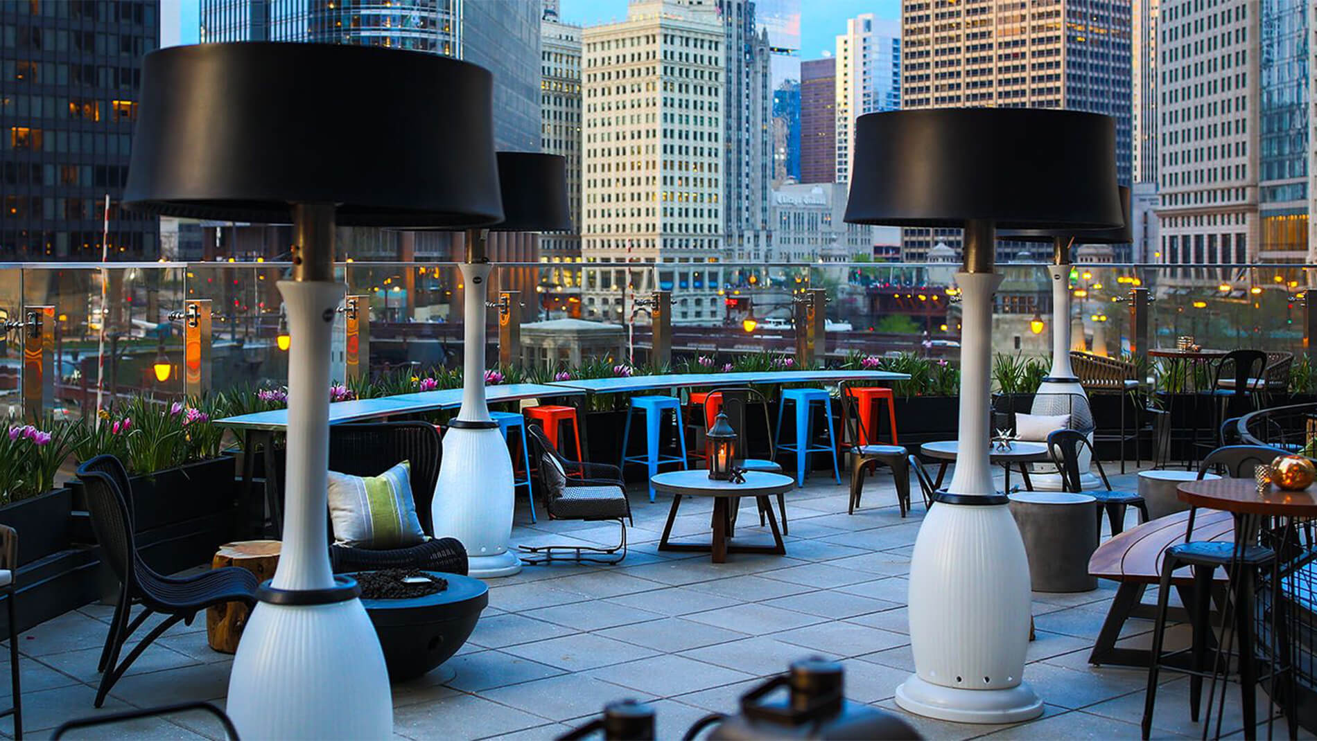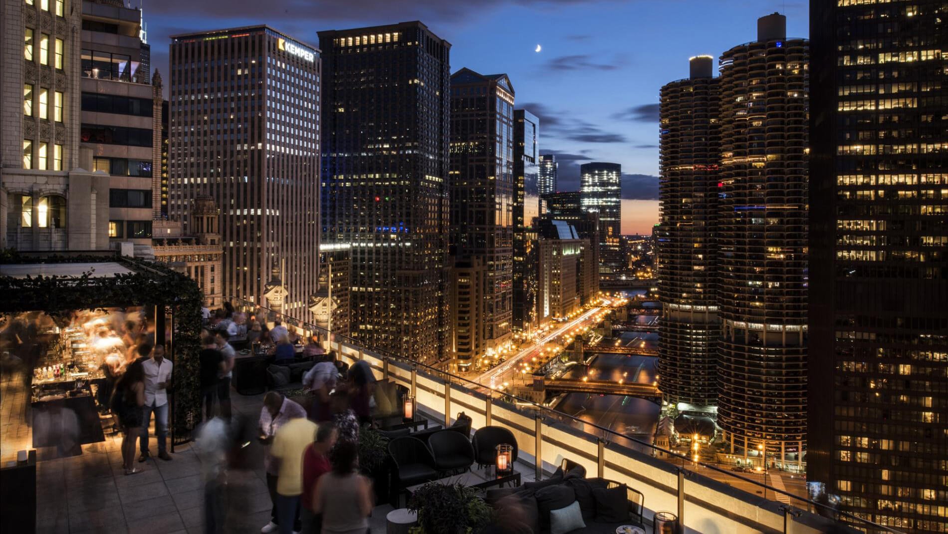 Elevator Pitch: Multi-level riverfront rooftop lounge with dramatic views of the Chicago River, elegant cocktails, and indoor/outdoor seating.